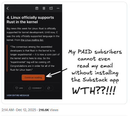 Readers are being forced to download the Substack app to finish viewing a newsletter.